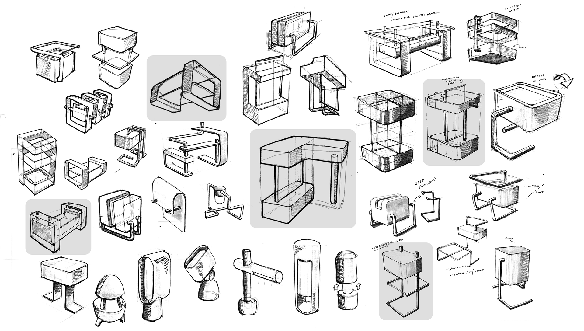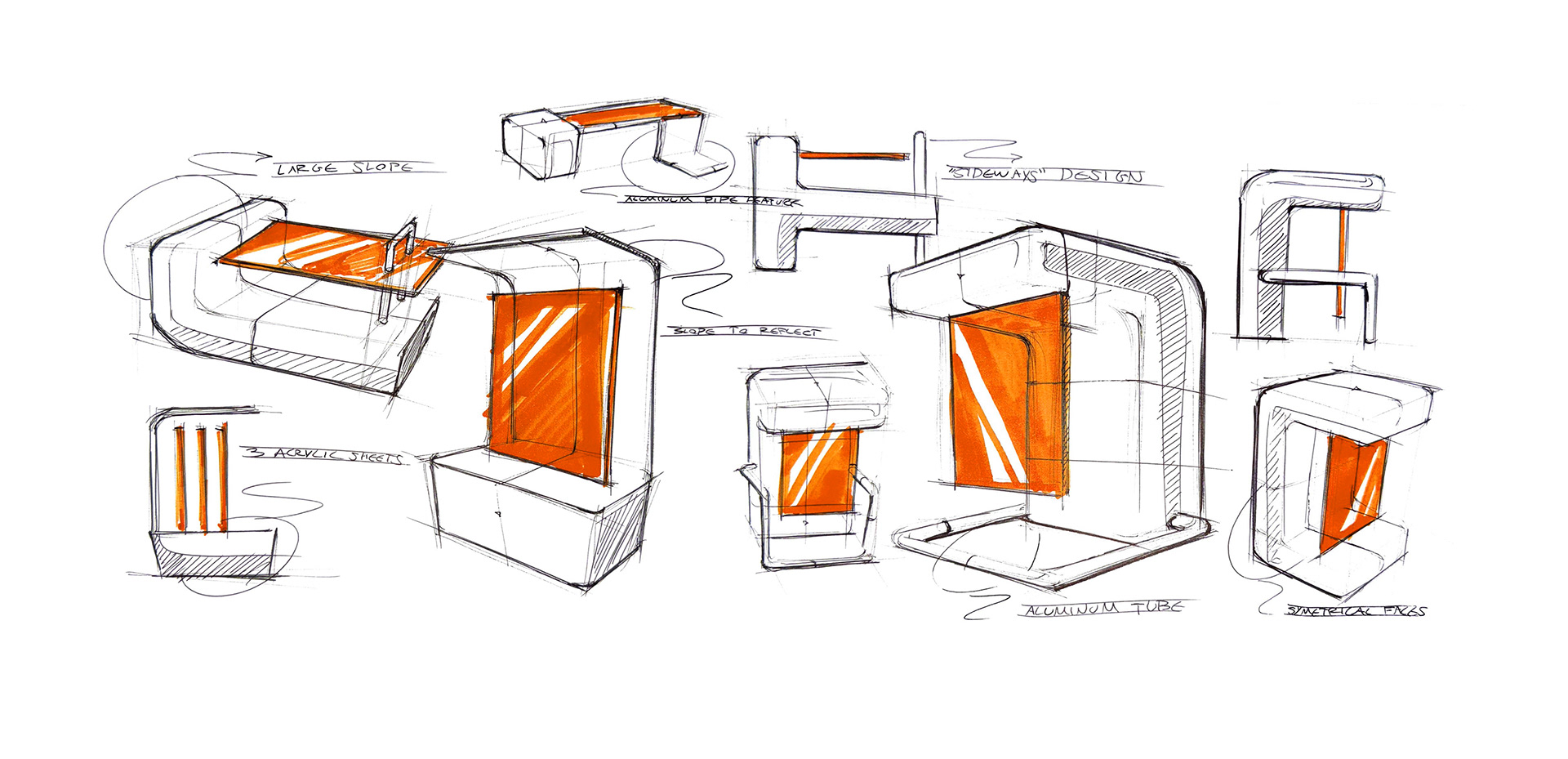 Initial concept sketches explored form, proportion, and the interaction of planes to direct light. Rapid studies tested how acrylic surfaces reflect and diffuse illumination.