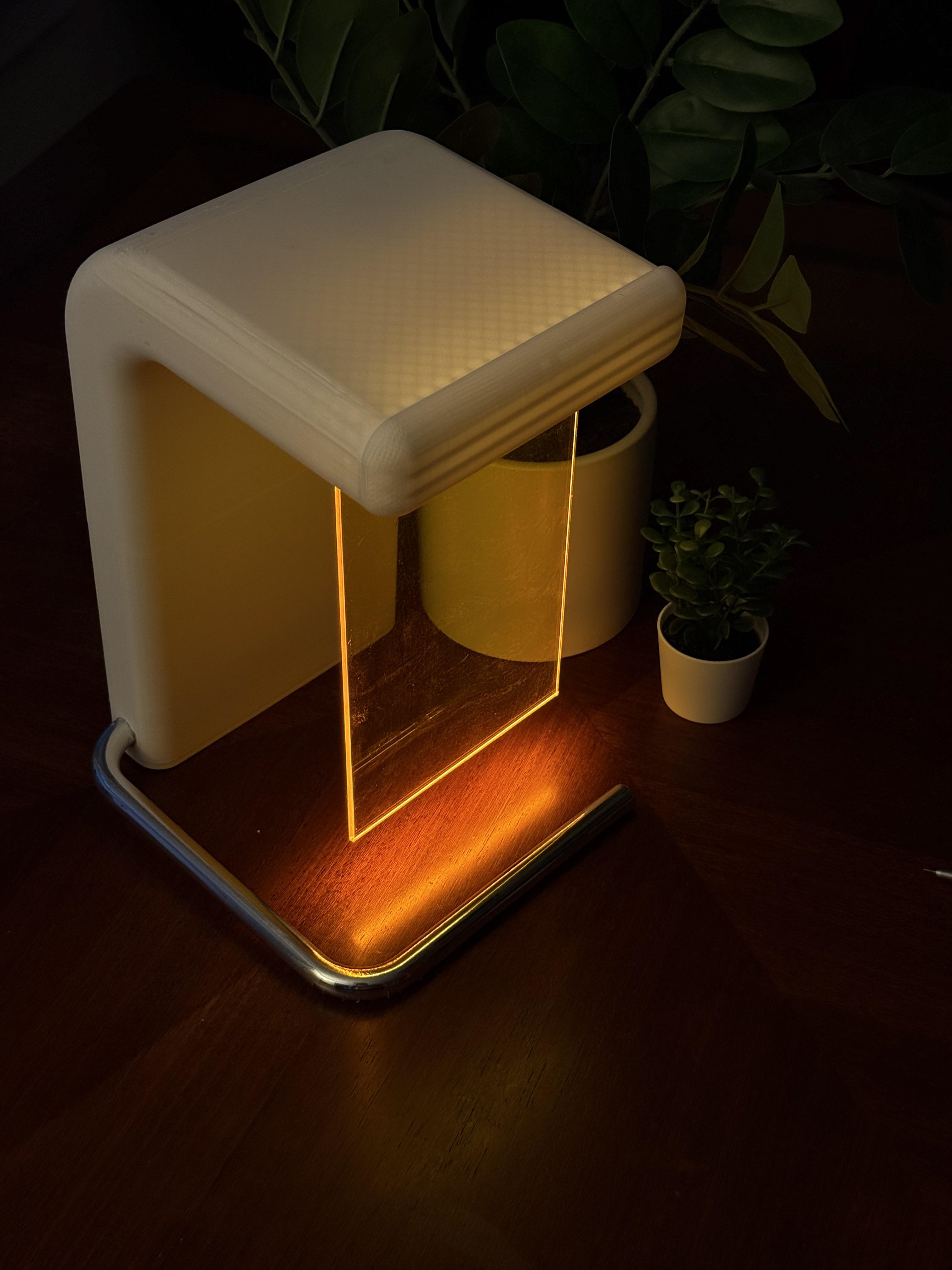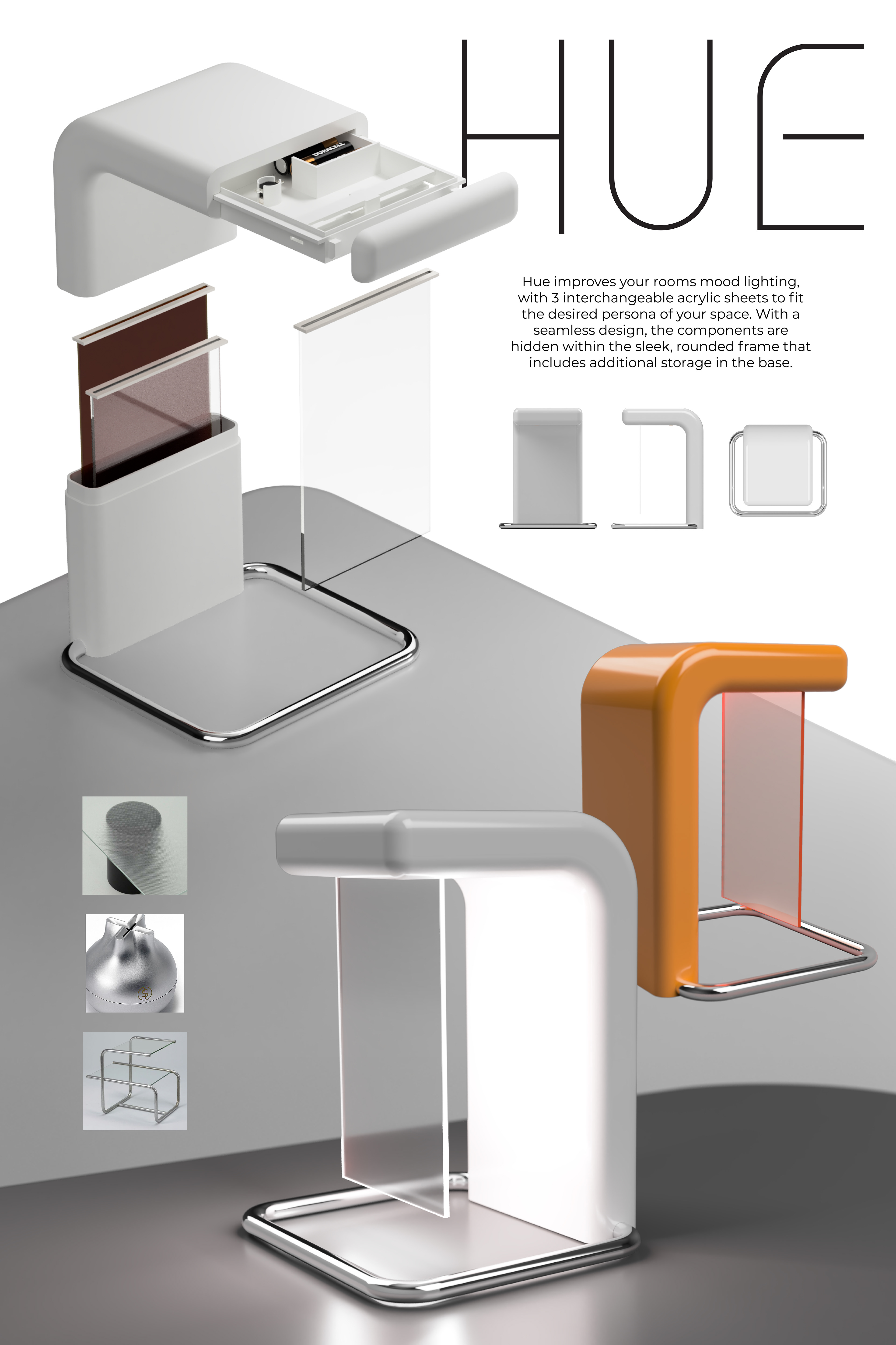 Showcasing the form, battery placement, interchangeable acrylic sheet mechanism as well as additional storage for different colored acrylic in the base of the lamp.