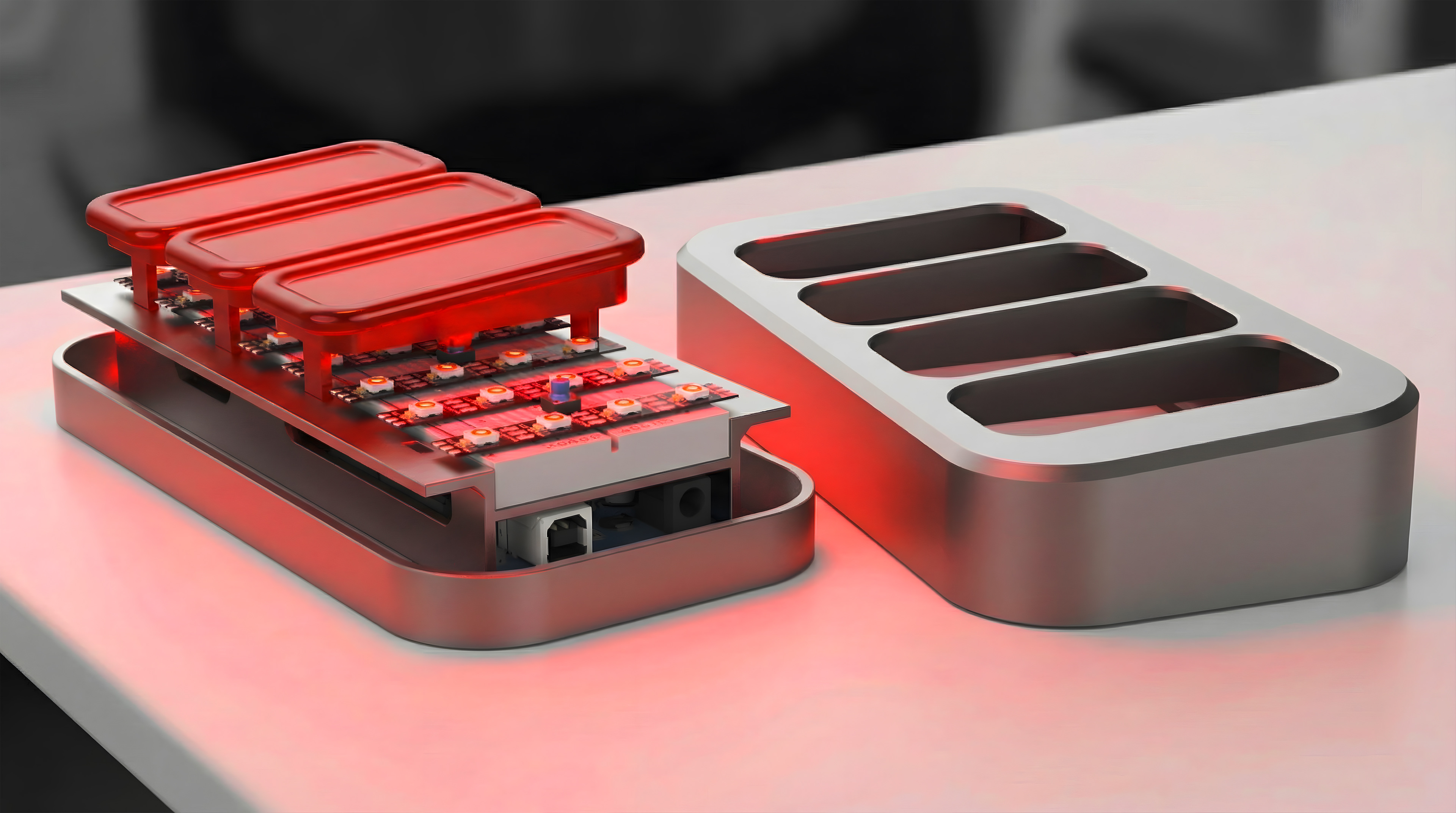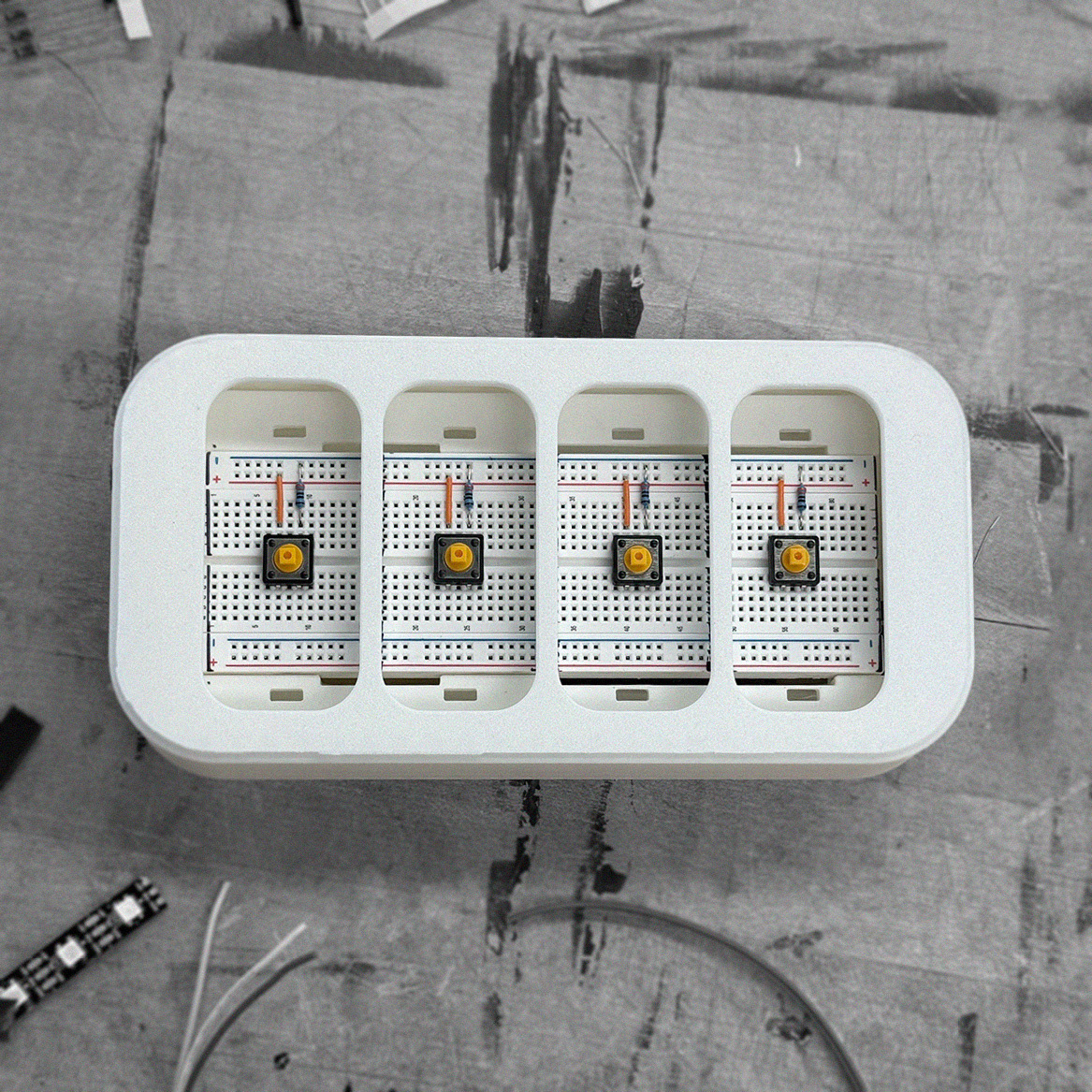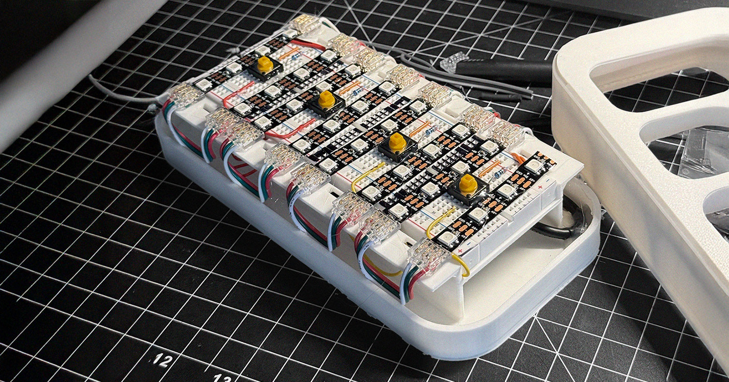 3D modeled in Fusion 360, carefully accounting for overhanging edges, and taking close detail of measurements for fit tolerances making sure that the Arduino, breadboard, and other components are snap fit. Made sure to model around having space to tuck wires, so that everything is seamless and proffesionnaly organized. Addressable LED strips are used to illuminate the buttons, coded into 4 separate buttons, and connected via pinch connectors.
