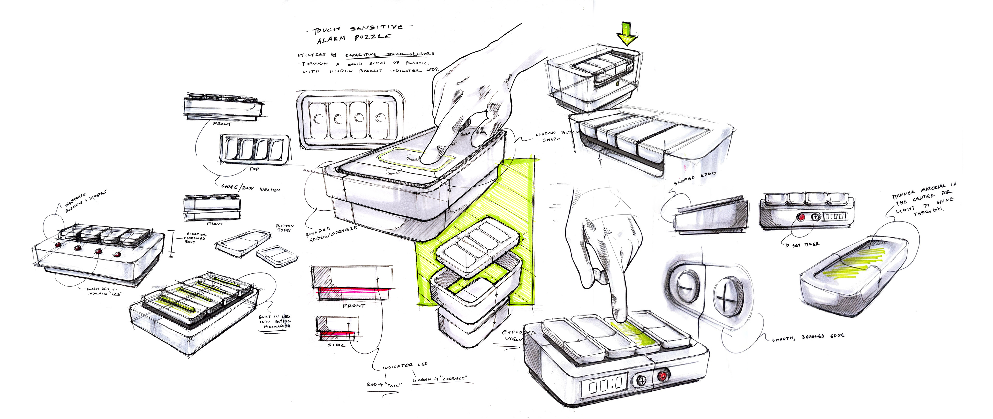 From the original sketches, I decided to further iterate on the rectangular push button design. Keeping a relatively thin form, designing to look at home in a college students room. Sketches closely resemble the appeal of an early 2000's alarm clock, bringing the aesthetic of digital LCD screens, as well as red and green lighting.