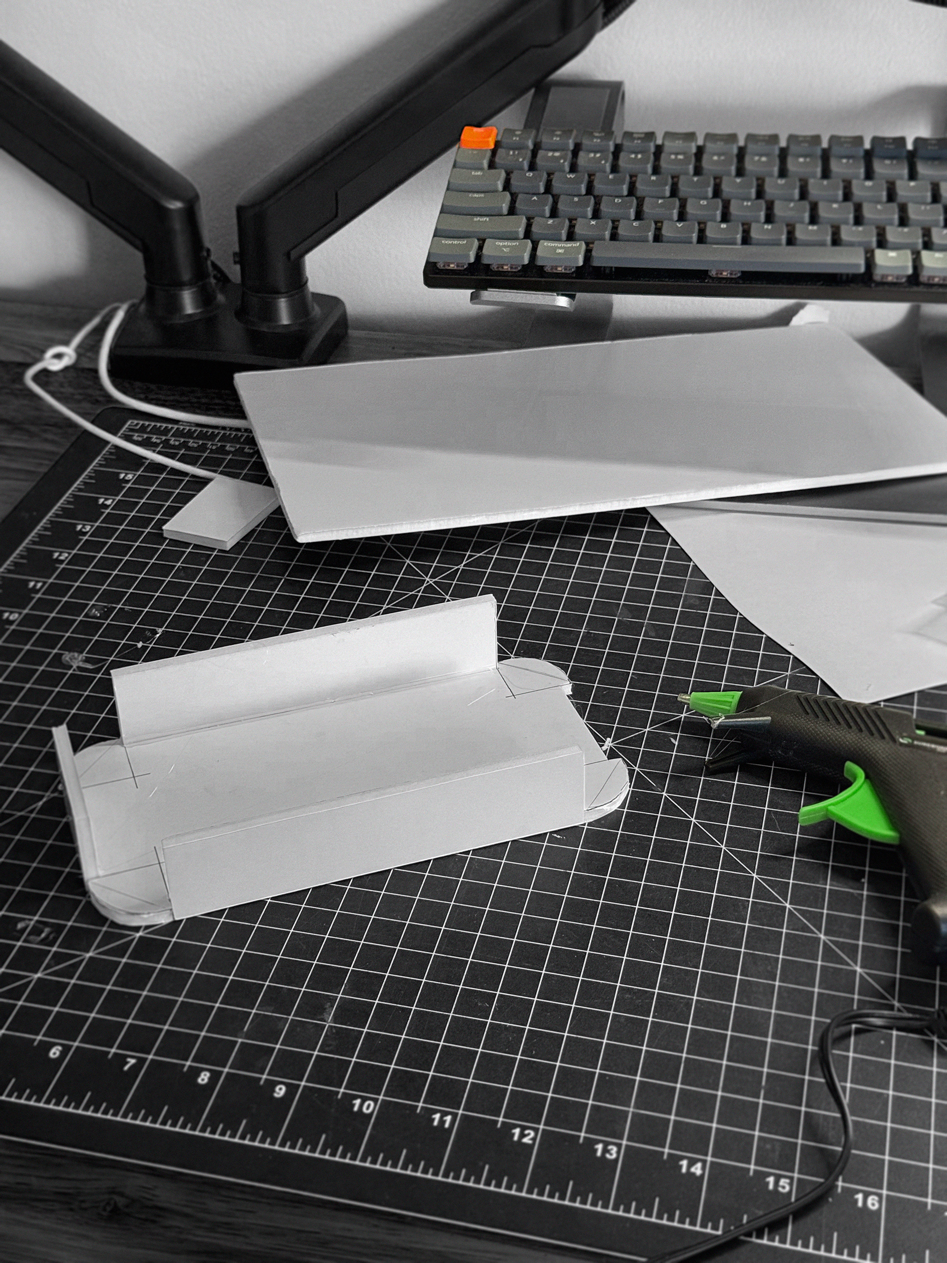 Using 1/8" foam-core sheets to establish a general understanding of overall form, proportion, and scale, while accounting for internal measurements and spatial relationships. This physical exploration helps inform design decisions and serves as a foundation for accurate and efficient future CAD modeling.