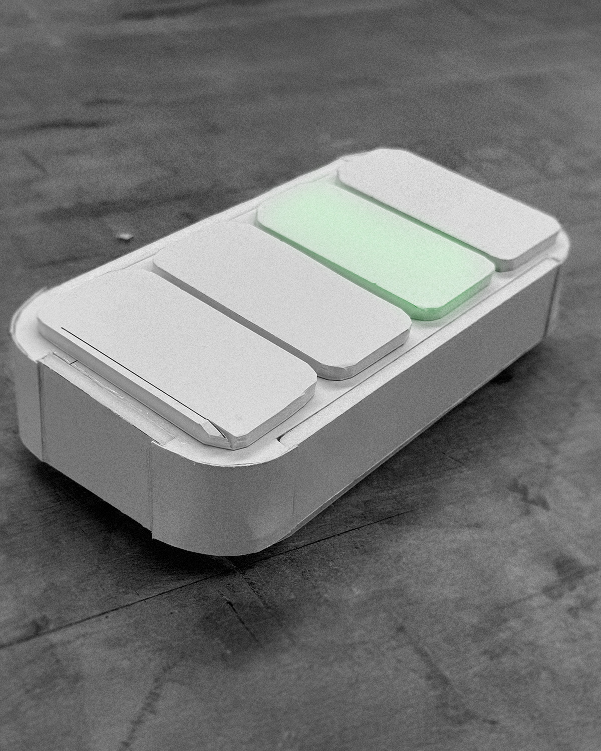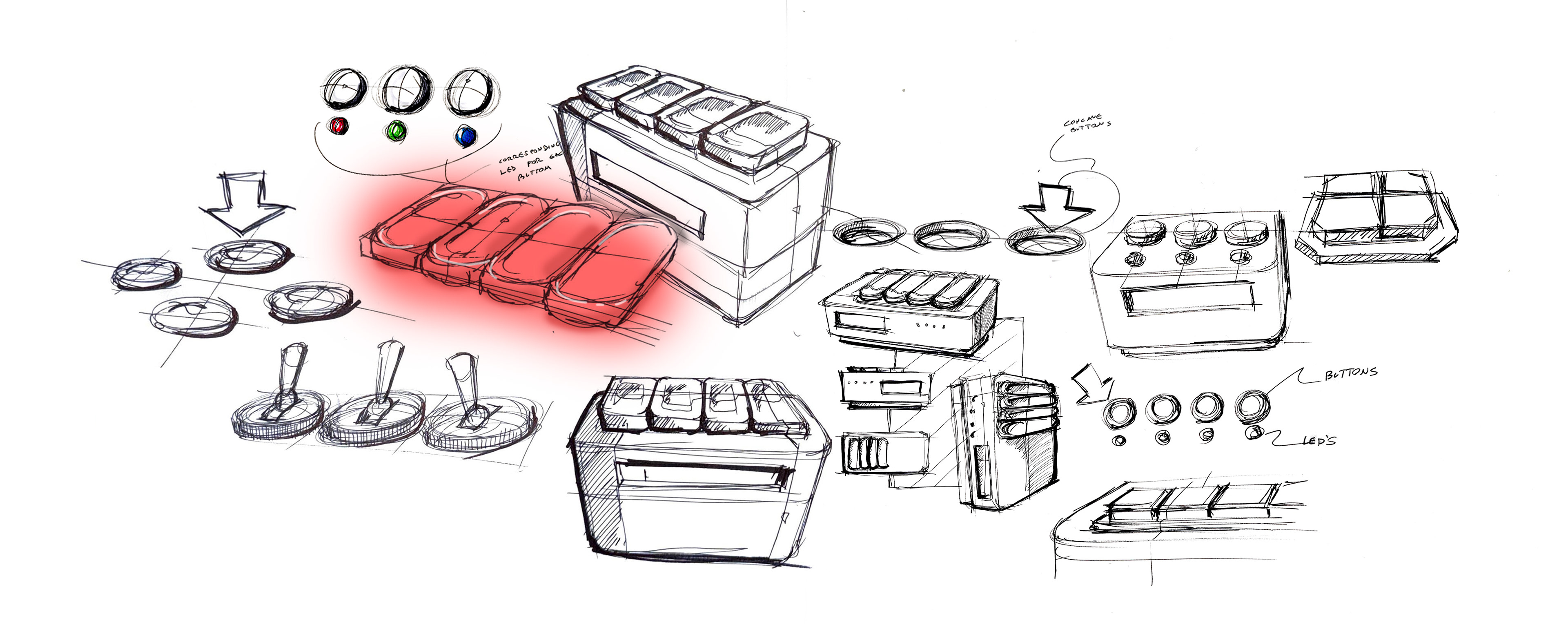 Putting ideas on the page, ideating on button form, product shape, size and details. Emphasis on color, and where light could be implemented. Working with different forms for actuation, including switches, button patterns, as well as differing shapes and sizes of actuators.